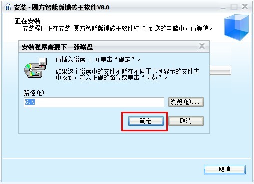 6、出現插入下一張盤的提示,請拿出A盤,放入B盤後,點擊“確定”繼續安裝,切記不要再點擊瀏覽更換安裝路徑,否則無法默認B盤文件