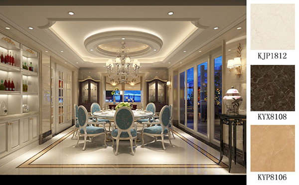 整個空間以淺色調為主,餐椅的一抹淺藍實現了整個空間色調的跳躍,更具韻味。地麵主要鋪貼金剛釉瓷磚水晶玫瑰KJP1812、搭配大理石瓷磚金王啡KYX8108、大理石瓷磚金世紀米黃KYP8106,與整體格調相輔相成,自然舒適。天花造型方中有圓,精美的水晶吊燈鑲嵌其中,奢華大氣,雍容華貴!