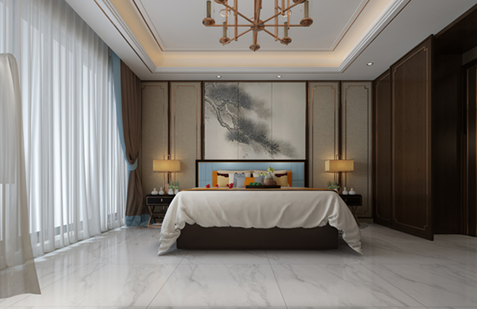 臥室家具采用實木紋,高貴大氣,設計成鬆子樣式的屏風完美的體現了不可居無鬆的文人理念,配合深蘊古風的燈具,更顯古典。白色係落地窗簾與地磚相得益彰,整個臥室透著一絲絲涼意。