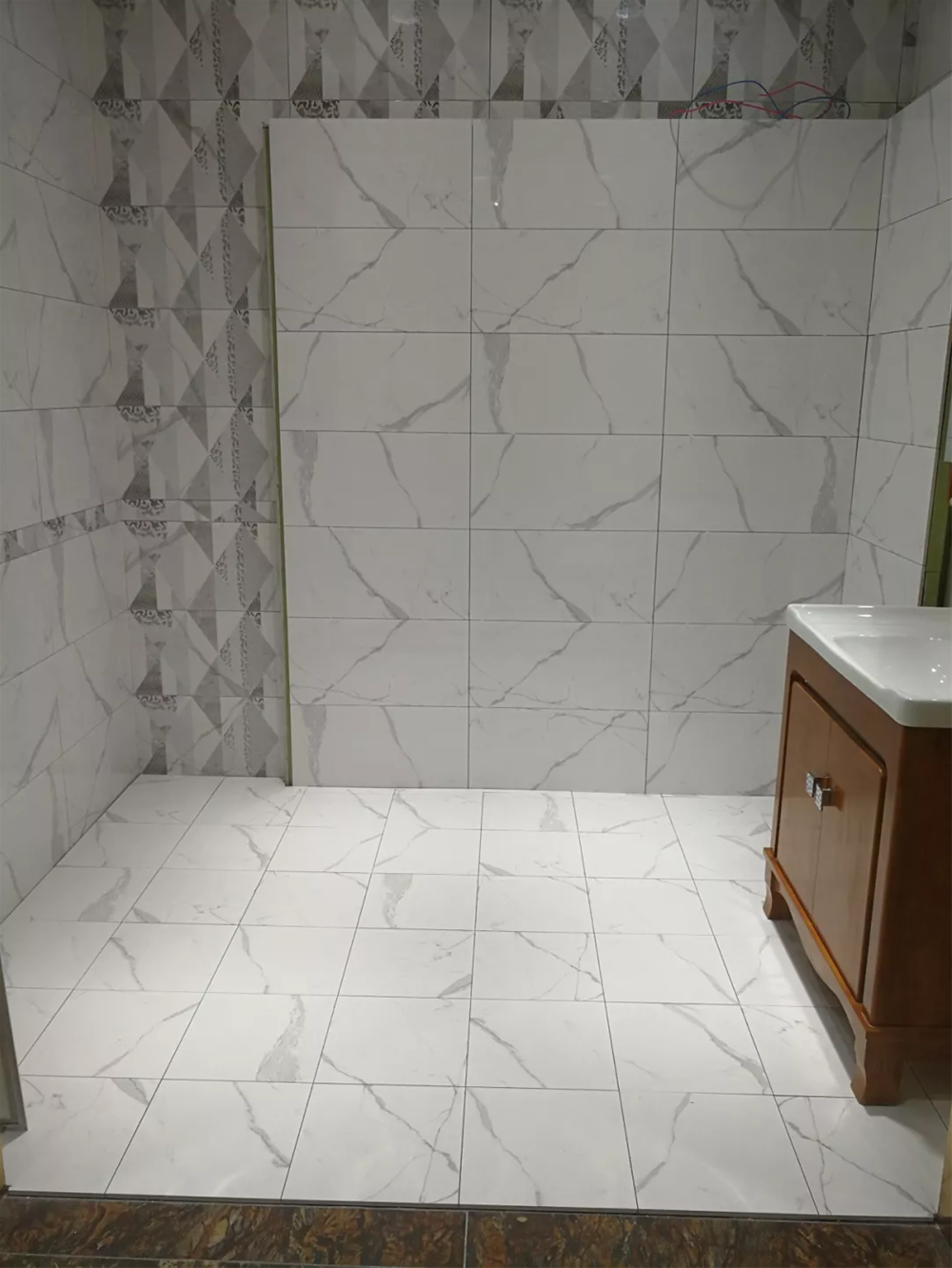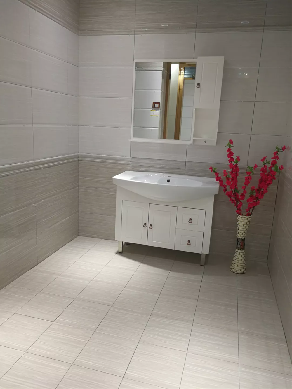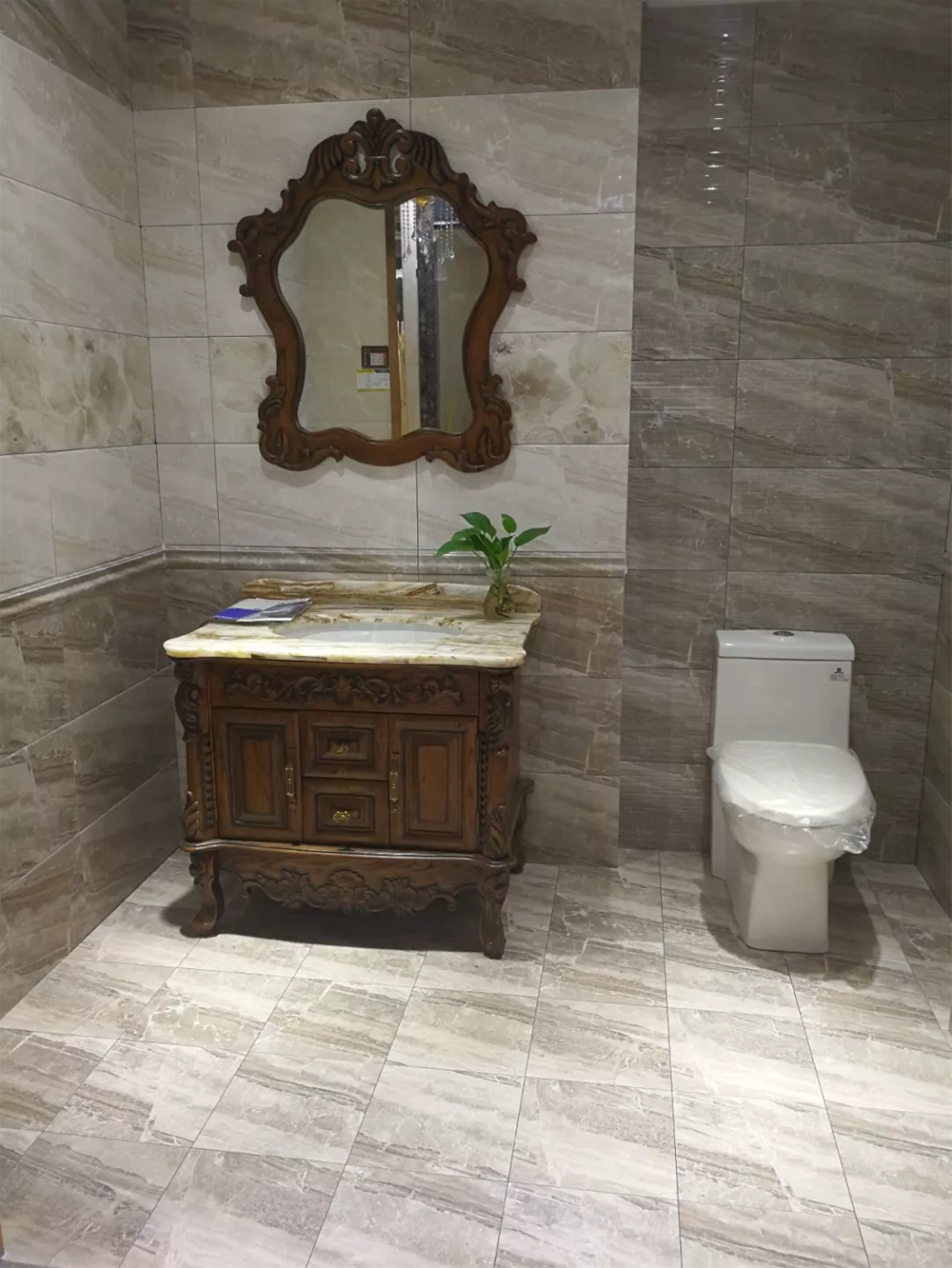 模擬間是專賣店必不可少的產品展示區域,它能很好地為消費者展示產品的鋪貼效果。由噴墨瓷片KPX36059鋪貼的現代衛生間,一深一淺搭配出空間層次感,地麵300*300的是防滑係數高的小地磚,非常符合衛生間防滑的需求。叼嘿软件下载大全陶所有的廚衛噴墨瓷片都配有花片、腰線、防滑小地磚,節省了消費者再找配套產品的不必要麻煩。
